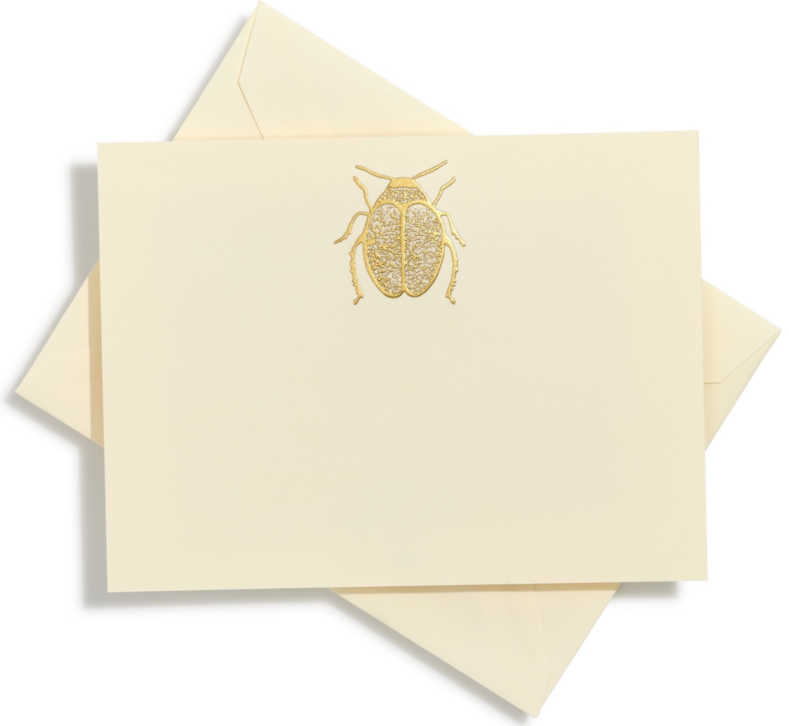 My skin crawls when bugs come in close proximity to me, and this is especially true the larger they are (sorry, Mr. Tarantula). Oddly enough, when the bugs aren't real, I have a real soft spot for them. In fact, I love them and this is evident from my J.Crew embellished bee print sweater to my antique scarab beetle pin (awesome Etsy find!). From clothing to accessories to home decor, my faux bug collection adds that elegant touch of whimsy I so enjoy.So what a delight it was for me to come across these beautiful gold scarab note cards by Bernard Maisner. The scarab beetle, a symbol of eternity and rejuvenation, is delicately engraved on 100% cream cotton stock cards. Elegant? Luxurious? Refined? Yes! Yes! Yes! Creepy-crawly? Not in the very least. Be still, my (faux) bug loving heart. I may need to find an excuse to start sending note cards more often.